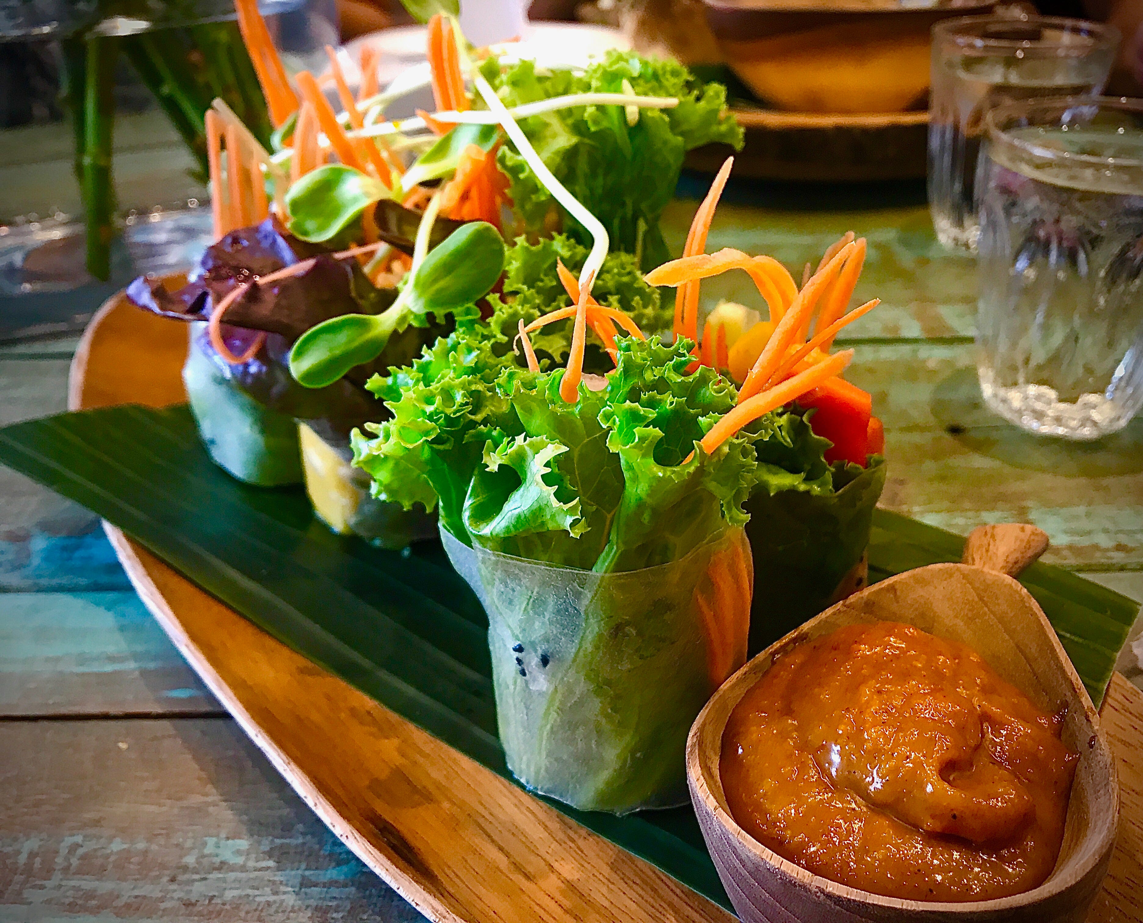 There, over humble vegan plates — summer roll or “Por-Pia-Viet-Nam” in Thai.. It filled with the juicy Mango ..the humble carrots, crisps lettuce , rice noodles, spring onion, pea shoots, tofu wrap in the soft translucent rice paper. But what elevate this dish is its secret sauce …It is like Satay but smoother, fresher and not over power the whole dish. It is THE sauce that I forever remember. This is not just the sauce … it is a sauce that remind me of commitment to be a good Buddhist! ( I tell myself). The sauce without a touch of life.. yet I never feel so lively when taste that creamy , sweet and salty.
